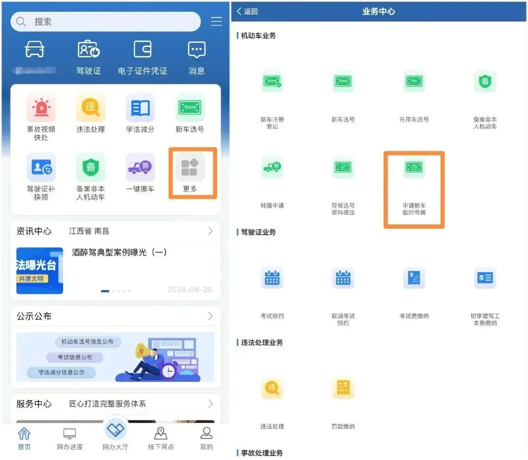 打开交管12123,点击更多,选择申请新车临时号牌,根据提示上传相关资料,审核通过后,就可以坐等临牌邮寄到家啦!